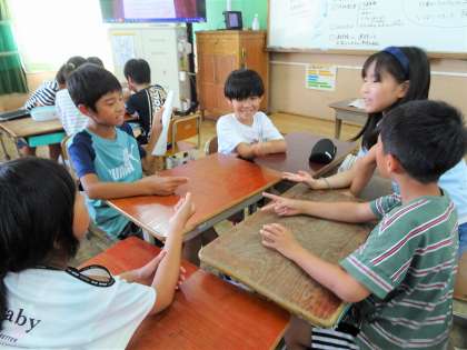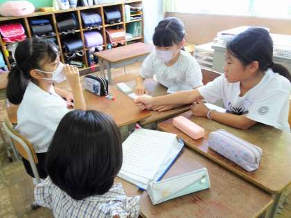 クラスでは、久しぶりの友達と夏休みの出来事を話し合いました。大変だった宿題に楽しかった出来事、グループのみんなに言いたいこと……など、じゃんけんで出た指の数で話題が決まります。わいわいと盛り上がる様子が見られました。