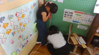 2学期初めの算数科は「長さ」の単元です。巻尺を使って、身の回りにある1mよりも長いものを測りました。「教室の縦の長さや横の長さを測りたい!」「教室にあるホワイトボードってどれくらいの長さなのかな。」「廊下の長さってどれくらいなんやろう。」と様々な疑問を出し合いながら活動していました。梅津小学校の廊下はとても長く、50mの巻尺では足りませんでしたが、ほかのグループの巻尺と合わせて何とか測ろうと頑張っていました。