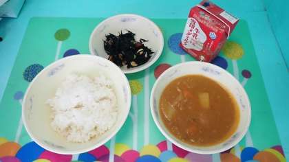スパイシーな給食調理員さんの手作りのルーは、とてもよい香りです。授業中から気になっていた子どもたちもいたようです。食べ応えのある豚肉はとても柔らかく、ごはんと一緒におなかいっぱいいただきました。