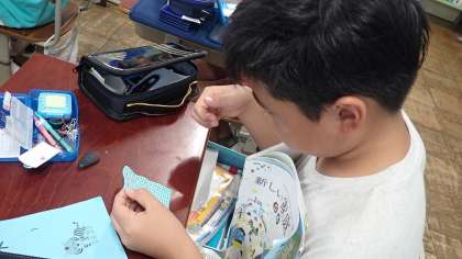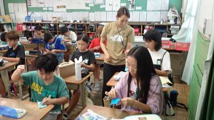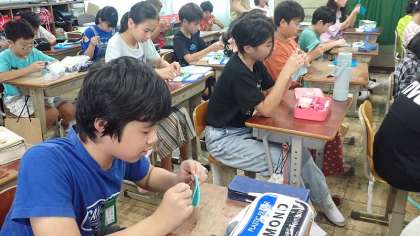 今日は、フェルトの生地を使った「小物入れ」づくりをしています。これまでに教わった、玉結び、なみぬい、玉止めとボタン付けの仕方を生かして、ていねいに作っています。みんな真剣な表情です。できあがった子は、満足そうに見せてくれました。