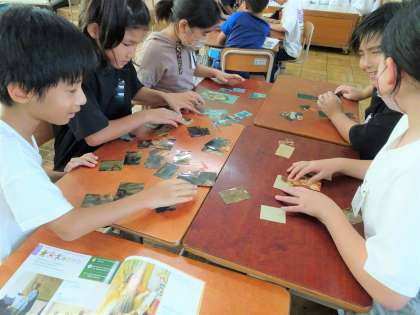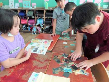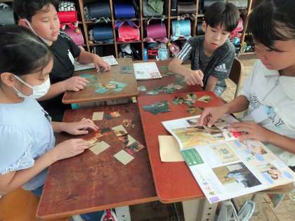 教科書の鑑賞が終わった後は、絵画パズルを楽しみました。パズルをすると、細かい背景の様子や人物の表情、ポーズをじっくり鑑賞できます。グループでわいわいと盛り上がりながら、パズルを完成させていきました。