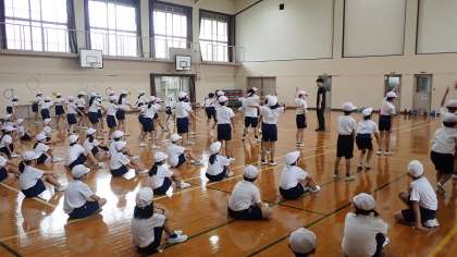 全体を半分に分けて、どんな演技になっているのかを互いに見合いました。波のように動きが流れていくのを見て、子どもたちから「おおっ」という声と拍手が上がっていました。