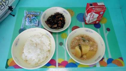 「じゃがいものそぼろ煮」は、じゃがいもやたまねぎ、糸こんにゃくを、鶏そぼろと一緒にいただきました。とろみがついているので、具材にそぼろがよくからみ、味わっておいしくいただきました。じゃがいもは、中までほくほくで、食べ応えも抜群でした。