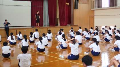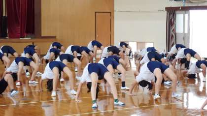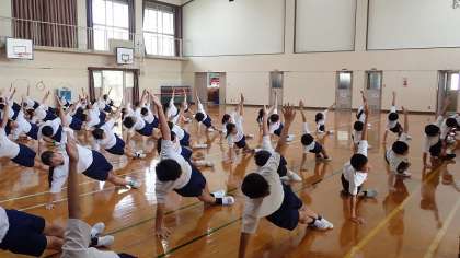 月曜日から練習を始めて、今日が2回目です。組体操の「一人技」では、指先や爪先、視線などに気を配って、技に取り組むことが大切です。まだうまくできない技もあると思いますが、1か月後の運動会本番に向けて、これからも練習をがんばってほしいと思います。