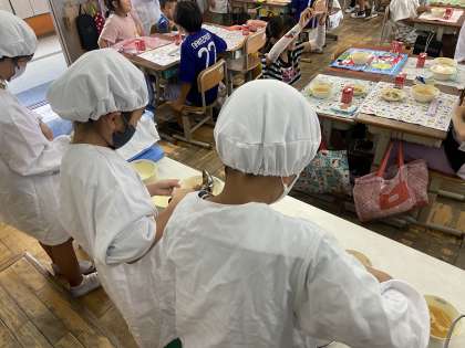 学習直後の給食の時間には、「しっかり髪の毛入れよう!」「安心安全な給食!」と、いつも以上に丁寧に当番の準備をしていました。