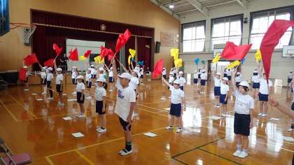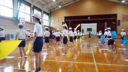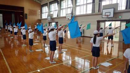 5年生はフラッグを使った演技に取り組みます。まだ練習を始めて間もないですが、少しずつ動きを覚えることができています。フラッグを振ると、迫力のある音が体育館に響きます。本番が楽しみです。