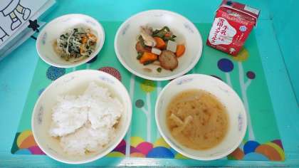 「平天とこんにゃくの煮つけ」は、甘い味付けで子どもたちにも人気の献立です。平天・鶏肉・こんにゃくだけでなく、にんじんも甘みがよく引き出されていて、ごはんと一緒においしくいただきました。「かぼちゃのみそ汁」は,かぼちゃが皮までやわらかく、かぼちゃの甘みがたっぷりのとてもおいしいみそ汁でした。