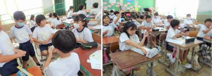 楽しい声が教室に響きます。4年生の外国語活動では、今文房具の言い方や、それを持っているか尋ねる学習をしています。担任や友だちとゲームを通してやり取りをする練習をしていきました。