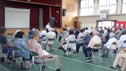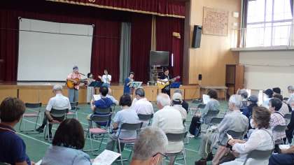 まず、体育館で梅津敬老会が行われました。梅津学区にお住いの70歳以上の方を招待し、長寿をお祝いされました。お祝いのミニコンサートでは、懐かしい歌を一緒に楽しんでいただくことができました。