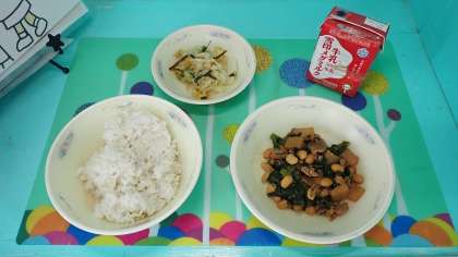 「肉みそいため」は、八丁みそが使われていてコクがあります。豚肉や大豆などの具にもよく味が染みており、ごはんにとてもよく合う献立でした。「ごま酢煮」は、酢のさっぱりした酸味がちょうどよく、口の中がすっきりします。肉みそいためと交互においしくいただきました。