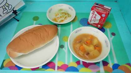 「ブラウンシチュー」のルーは給食調理員さんの手作りのルーです。バターが使われているので、コクのあるルーになります。豚肉やじゃがいもなど食べ応えたっぷりの具を、おいしいルーでいただきました。パンやソテーとの相性もぴったりで、おなか一杯おいしくいただました。