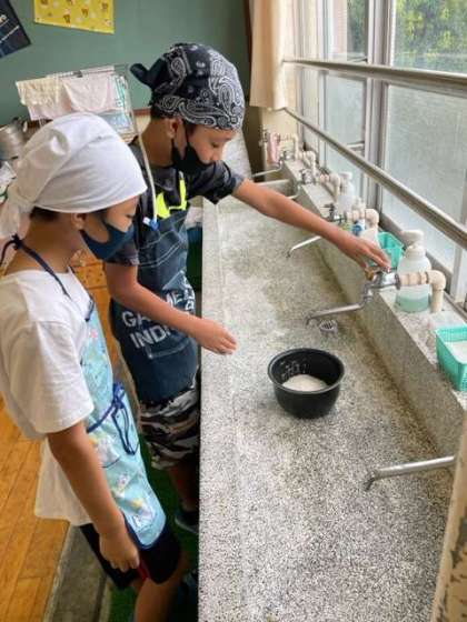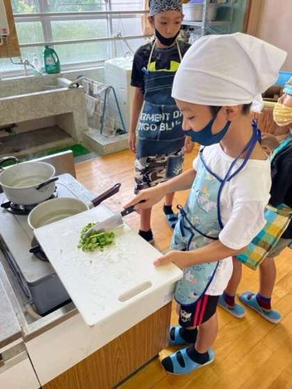 お米を洗い、炊飯をして、おにぎりを作ったり、収穫したナスやオクラを味噌汁に入れたり、ゼリーを作ったりしました。