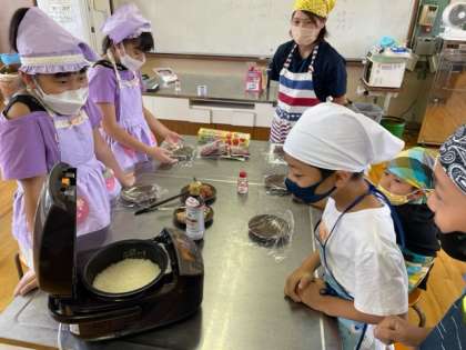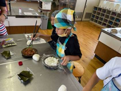 ごはんが炊けて、おにぎりを作っているところです。