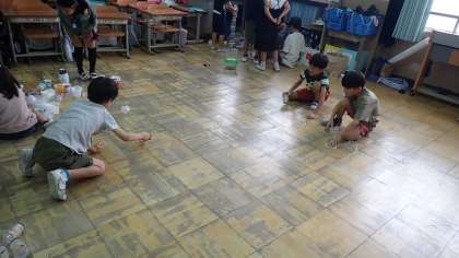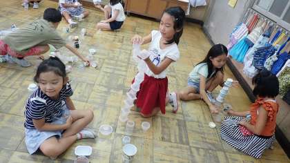 今日は、みんながあつめてきたたくさんのカップやプラスチック製の容器を使って、思い思いに遊びました。「積む」「はじく」「飛ばす」「転がす」など、いろいろな遊びが広がっていました。思いっきり遊んだ子どもたちですが、まだまだ遊び時間が足りなかったようです!それでも、時間になったらさっと片付ける姿はとても立派でした。