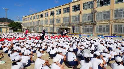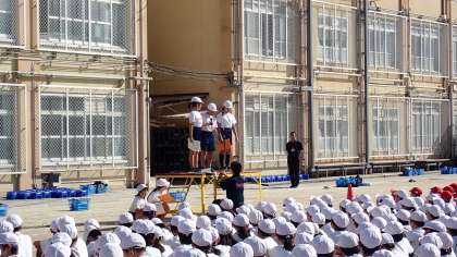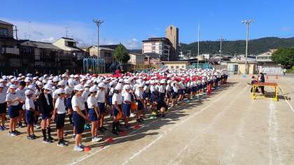 全校のみんなが揃って行う運動会は4年ぶりです。運動場に整列し、開会式と閉会式の練習を行いました。