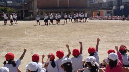 応援席に戻ってから、エール団が中心になってエールの練習をしました。みんな大きな声で、かけ声を出していました。応援があると、運動会気分が盛り上がります!