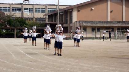 集団行動、組体操、ダンスの3つの演技を組み合わせています。たくさんの内容にも一生懸命に取り組む姿はさすが最高学年です。本番の演技を楽しみにしていてください。