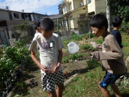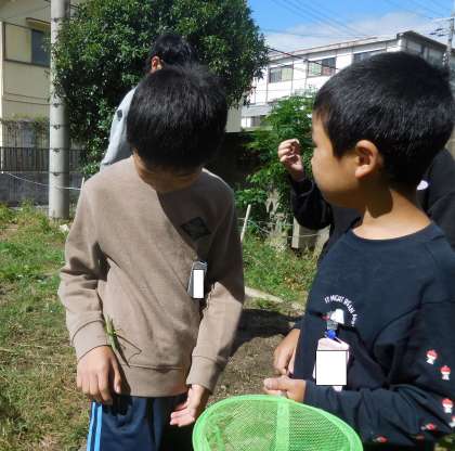 虫取りに熱中していたむくのき学級でしたが、たくさん捕まえたバッタを逃がしました。畑でフタをはずすと、すぐに逃げていくバッタや、服にくっついて離れないバッタがいました。子どもたちは「かわいい。」「もう懐いてるんやわ。」と、とても名残惜しそうにしていました。
