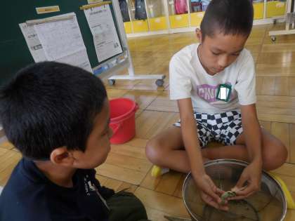 イエローポップ(とうもろこし)とおくらの種とりをしました。イエローポップは、ポップコーンになるもので、運動会が終わったら調理をしようと計画しています。おくらの種とりでは、普段食べていたものが乾燥して、いつもと違った形や色になっていたので、子どもたちは、驚いた様子でした。