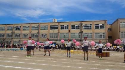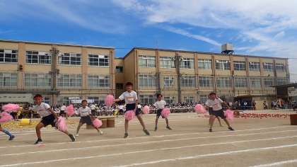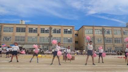 全校競技の玉入れの前に、みんなで気合を入れます!今日の運動会では、「エール団」のほかにも5・6年生がいろいろなところで活躍してくれています。そんな高学年のがんばりによって、みんなの運動会が支えられているのです。