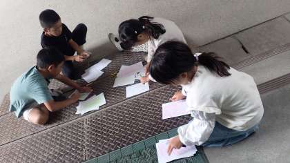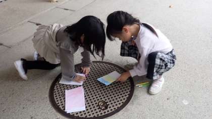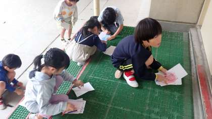 画用紙やコピー用紙に、いろいろなでこぼこを写し取っています。「こんなもようが取れたよ」「おもしろいもようになったよ」など、楽しそうに活動していました。このあとは、写し取った模様を切り取って、画用紙に貼っていくそうです。