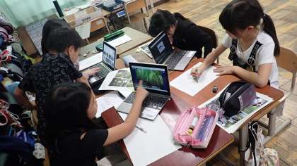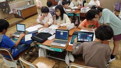 これまでの学習で調べたことを、「梅津の歴史」「梅津の自然」「梅」などテーマごとのグループでまとめています。どんなまとめ方をするとわかりやすい発表になるかを工夫しています。