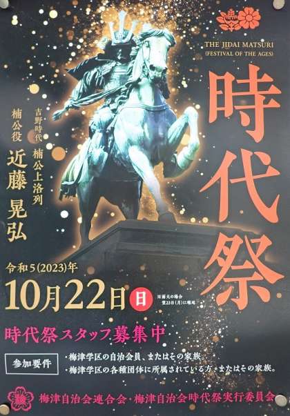 明日、京都三大祭りの一つである「時代祭」が行われます。今年度、梅津学区は23年ぶりに当番学区となり、「楠公上洛列」を担当します。