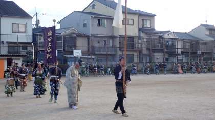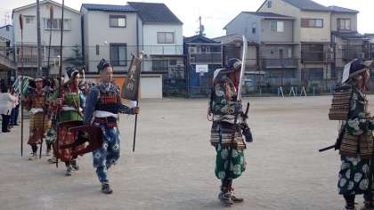装束の準備が整った後は、運動場を使って行列の練習をされました。法螺貝、太鼓の音を響かせて、運動場を歩かれました。今回の「楠公上洛列」には、梅津小学校の児童も参加しています。大人の方に交じって、一緒に歩きました。