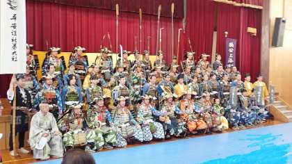 その後、主将 楠木 正成 公のあいさつがあり、正成公の「出陣じゃ!」の掛け声に続いて、みんなで「えい えい おう!」という鬨の声を上げられました。