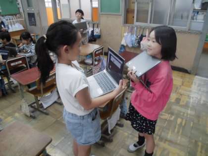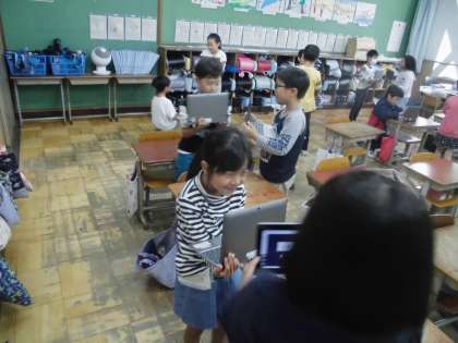 今日は、自分が欲しいサラダの材料を友達が持っているかどうかを「Do you have〜?」の表現を使って尋ねていきます。持っている場合は、タブレットでその材料を送ってもらい食材ゲットです。この表現を使って欲しい材料を持っている友達を進んで探し回り、繰り返しコミュニケーションを取ることができました。