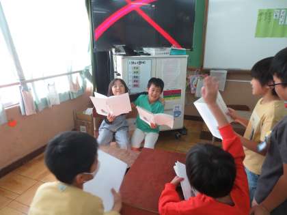場面ごとに3人組を作り、ナレーター・かえるくん・がまくん(またはかたつむりくん)の役に分かれて音読をします。