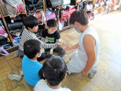 カマキリを育てているクラスでは、餌にしていた昆虫が見つからなくなってきたので、代わりに家から蒲鉾などを持ってきて与えることにしたようです。