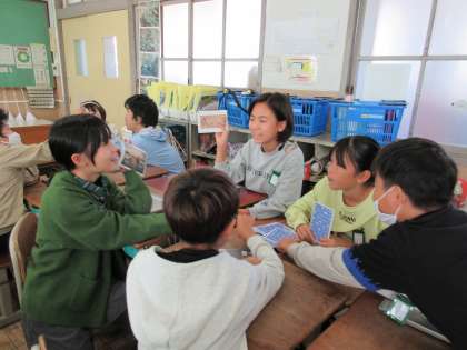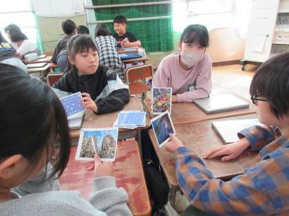 有名な絵画や風景画などが印刷されたカードを引いて、題名をつけたりお話を考えたりしてグループで伝え合いました。じっくり絵を鑑賞することや同じ絵を見ていても人によって感じ方が異なることを子どもたちも楽しむことができました。