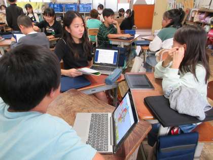 いろどりの学習では、梅津小学校をよりよくするために自分たちにできることについて考え、会社を立ち上げ、活動してきました。5年生全体で小グループをつくって、他クラスの友達にこれまで活動してきたことや働くことで感じた思いを伝えることができました。