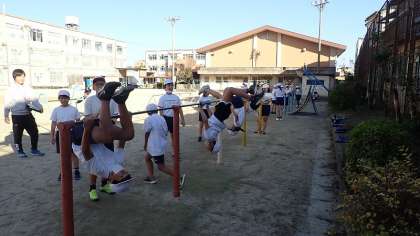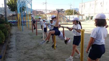 5年生は、体育の「鉄棒運動」の学習をしています。