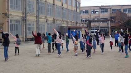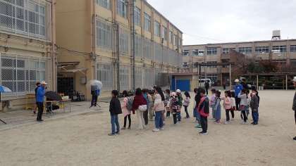 はじめに、運動場に集合し、支部長のごあいさつのあと準備運動をしました。続いて、イベントの説明をしてくださいました。今日は、「ブラックダルマ王軍団」の侵略に立ち向かうべく3つの挑戦をクリアして数字をゲットし、最後にダルマ王との対決を行います。