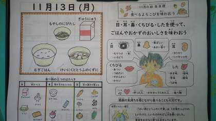「鶏肉ととうふのくず煮」は、ふわふわのとうふと豚肉をしょうがの香りの効いたくず煮でいただきました。急に寒くなった今週ですが、とろみがあり、体の中からぽかぽかあたたまる献立でした。「もやしの煮びたし」は、シャキシャキした食感のもやしを、おいしいお出汁と一緒にいただきました。