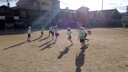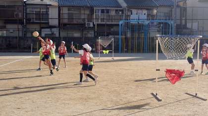 パスをしてボールをつないで、ゴールをめざします。有利な場所に動いたり、積極的にシュートをしたりして、ゲームを楽しんでいました。