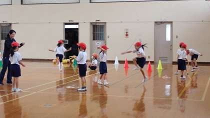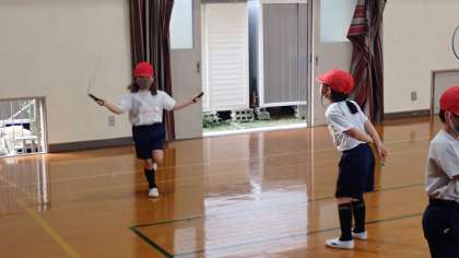 「なわとび」では、短縄をつかって前とびや片足とびなどの技に挑戦しています。調子よく連続で何回も跳ぶことができる子もいるようです。