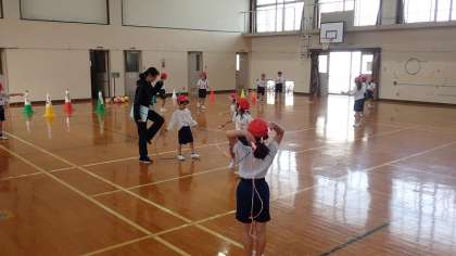 1年生は、体育の「ゆっくりかけあし・なわとび」の学習をしています。