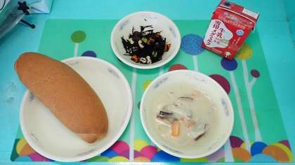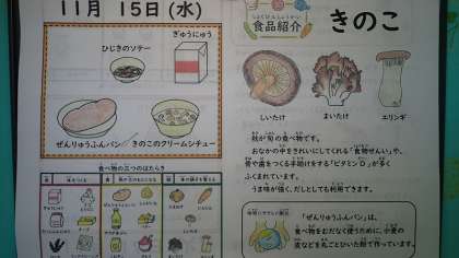 「きのこのクリームシチュー」には、しいたけ、まいたけ、えりんぎが入っています。中でも、えりんぎはとても弾力があり、ぷりぷりした歯ざわりでした。子どもたちの中にはきのこが苦手…という子もいますが、今日のシチューではきのこもおいしく食べることができました。