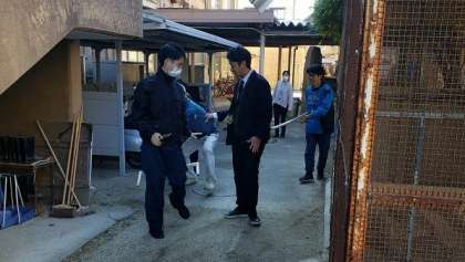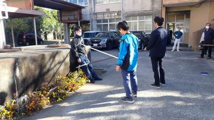 不審な人物が正当な理由なく校内に侵入し、退去しないため110番通報を行いました。また、対応した教職員に対して危害を加えようとしたため、さすまたを使って侵入者を拘束する実践的な訓練を行いました。