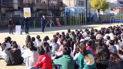 警察官が到着し、不審者を確保した後は、全校の子どもたちが運動場に集合し、右京警察署の方から訓練の講評と「いか・の・お・す・し」についてのお話をしていただきました。