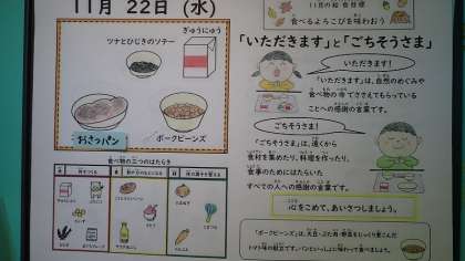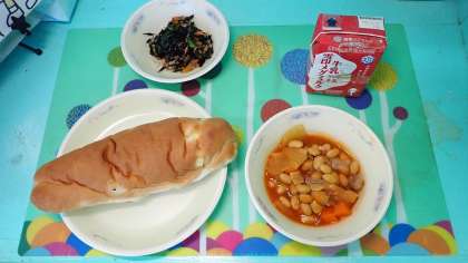 「ポークビーンズ」は、ほくほくの大豆とやわらかい豚肉を、甘酸っぱいトマト味でおいしくいただきました。トマトのさわやかな酸味と甘みが食欲をそそりました。今日のパンは「おさつパン」でした。さつまいもの甘みとふかふかのパンを味わっておいしくいただきました。