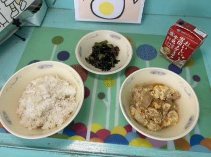 「あげたま煮」は、甘みがたっぷりの油あげとたまねぎ、にんじんと、蒸すように調理したとき卵の献立です。卵が入ることで味がまろやかになり、ごはんにぴったりの献立です。ごはんとあげたま煮を口の中で一緒に味わって、おいしくいただきました。