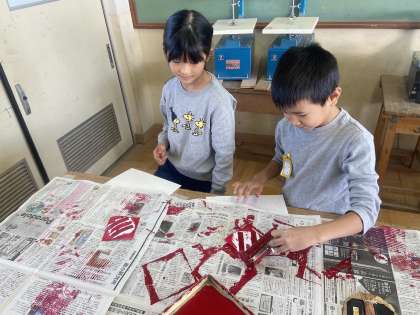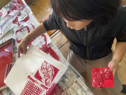 図画工作の学習では、版画に取り組んでいます。今回、3年生は身の回りにある材料を使っています。段ボールや、リボン、緩衝材など、いろいろな版をペタペタとうつしていました。材料によって出来上がる版の形が異なるので、子どもたちは夢中になって版を摺っていました。