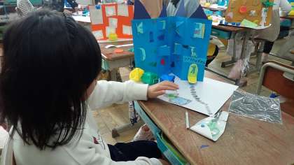 2年生は、図工の「まどからこんにちは」の作品づくりをしています。