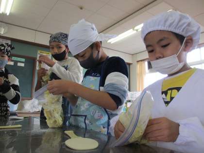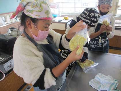 スイートポテトづくりでは、袋に入れたサツマイモを指でつぶしました。念入りに、しっかりつぶすことができました。