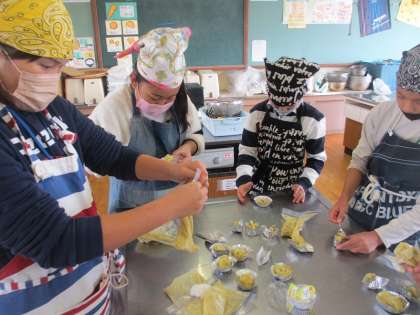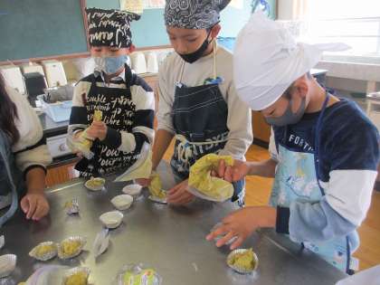 つぶしたサツマイモをアルミのカップに入れ、トースターでしっかり焼いてスイートポテトの完成です。このほかにも、大学いも、ふかしいも、スイートポテトを「あん」にしたおだんごも作っています。