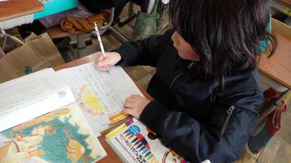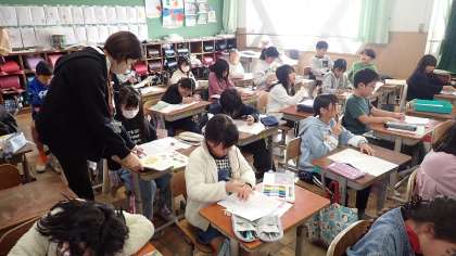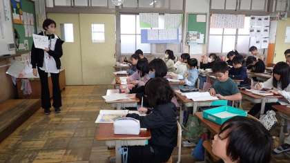 韓国・朝鮮の民話である「三年とうげ」を読み、お話のおもしろさを伝える「ポップ」を書いています。お話の「名セリフ」やおもしろいと思った場面などをキャッチコピーにして、ポップづくりをがんばっています。